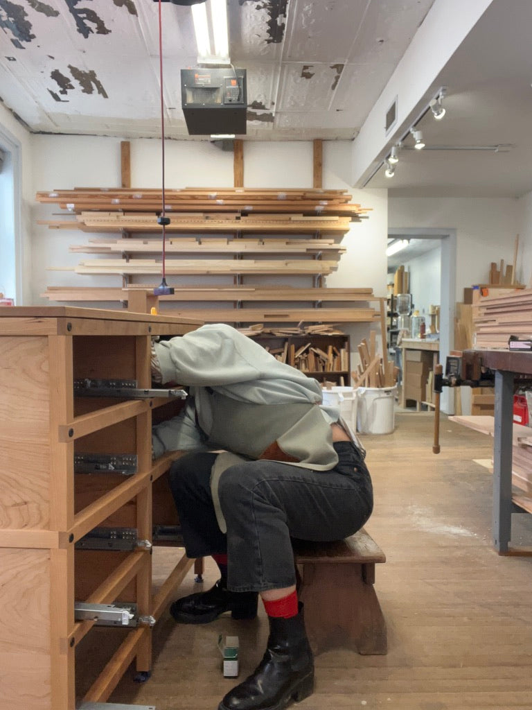 Jennifer June is a designer and maker whose work explores the relationship between materials, process, and place. Through her studio, Loose Parts, she builds furniture that bridges craft and system, pieces shaped by hand yet grounded in a clear structural logic. Drawing from the Arts and Crafts, Bauhaus, and Wiener Werkstätte traditions, her work values what’s visible: the joinery, the grain, the trace of how something was made.